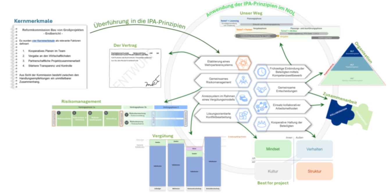 NordOstLink – Erarbeitung des partnerschaftlichen Tiefbauvertrages und Einführung der Integrierten Projektabwicklung Der NordOstLink (NOL) ist eines der wichtigsten Hochspannungs-Gleichstromleitungen (HGÜ) für die Energiewende. Auf rund 190 Kilometern Länge transportiert er künftig saubere Windenergie aus Schleswig-Holstein nach Mecklenburg-Vorpommern. Mit dem Verbau von bis zu 6 Systemen parallel und einem Arbeitsstreifen von bis zu 116 Metern Breite bietet das Projekt genügend Raum für eine effiziente und reibungslose Umsetzung. TenneT TSO setzt bei der Umsetzung des Tiefbaus auf eine partnerschaftliche Vertragsform (IPA). Das bedeutet, dass das Tiefbauunternehmen nicht nur den Bau übernimmt, sondern auch die komplette Ausführungsplanung verantwortet.
